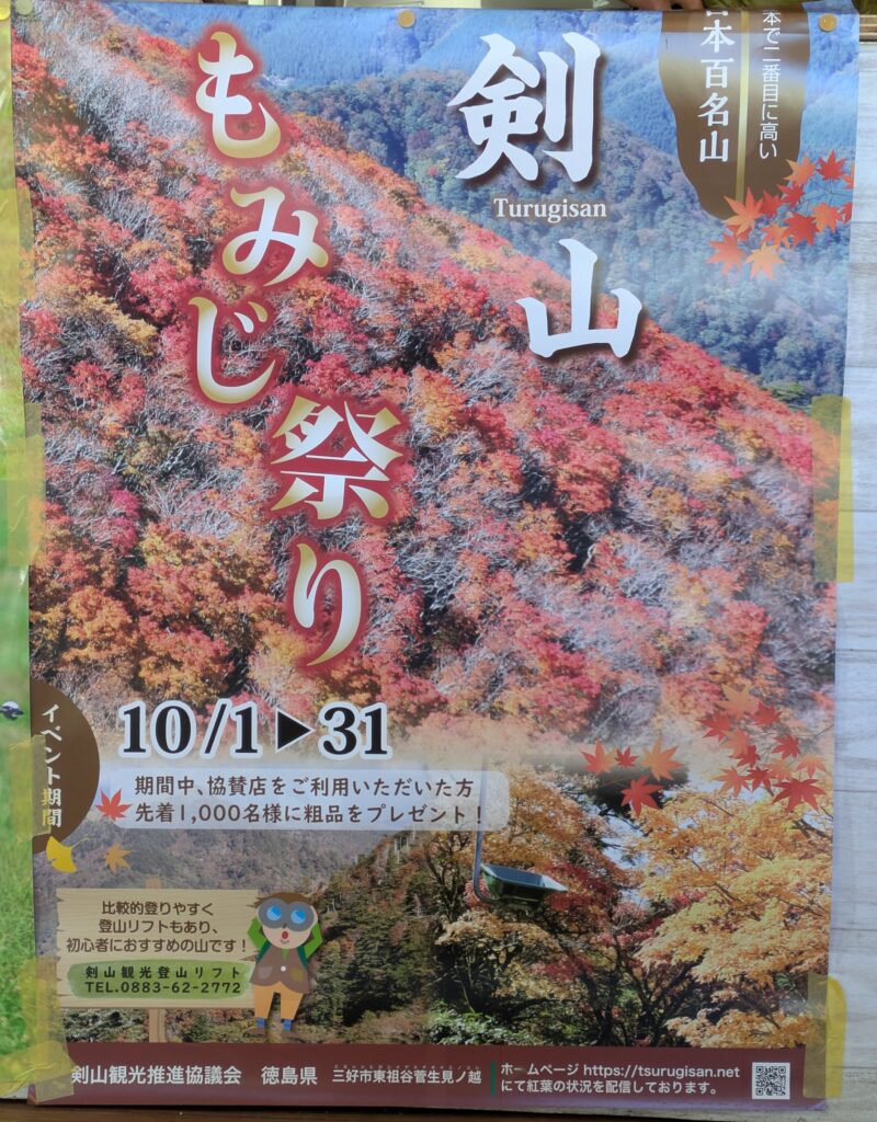 2025年10月1日 / 最終更新日時 : 2025年10月1日 admin 観光情報 / Sightseeing 剣山もみじ祭り 秋が訪れ、剣山の木々も色づき始めています。 本日10月1日から剣山もみじ祭りです。 例年、剣山では10日ごろに山頂付近から紅葉が始まり、中旬、下旬にかけて徐々に見ノ越方面へと下っていきます。 期間中はイベントやプレゼントがございます。 三味線もちつき 10月5日(日)午前11時~ 午後1時~(詳しくはこちら) 粗品プレゼント(詳しくはこちら)